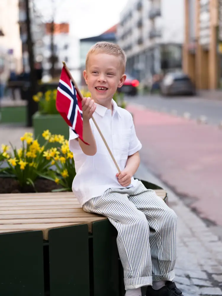 En blid og feststemt gutt får beveget og pyntet seg med en behagelig bomullsskjorte og chinos. Prikken over i’en er en sløyfe, og selvsagt et flagg å holde i. En dressjakke er selvsagt flott på en liten kar! En blå dress med lysere blå skjorte er pent og stilig, og med sløyfe og flagg i hånda er det bare å synge med til nasjonalsangen. En genser over skjorte og slips er preppy og pent, et sikkert valg.