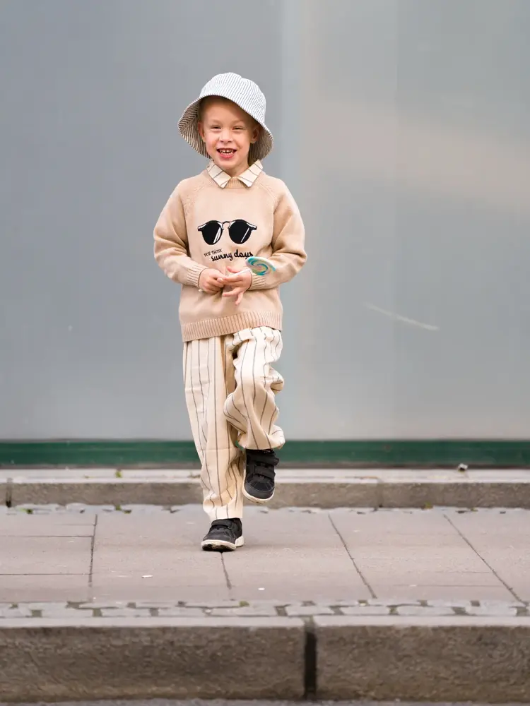 Beige genser 280,- stripete skjorte 329,- beige bukse 320,- alt fra Brando Kids