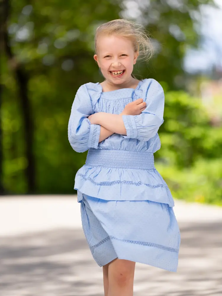 Blå topp med volang fra Woolland, kr 600, skjørt Woolland, kr 450. Hårspenner fra Lindex, kr 59,99 for sett med fire spenner og fire strikker.
