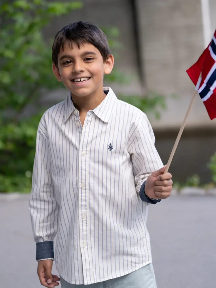 -Altså, en liten gutt i lys lindress, så stilig det er! Stripete skjorter og shorts i lin er tidløst og fint, det oser av vår og kan gjerne brukes i barnehage og på skolen, når 17. mai er vel overstått. Duse striper bidrar til et noe mer pyntet uttrykk, og er en enkel måte å gjøre et antrekk 17. maiklart, sier Elen.