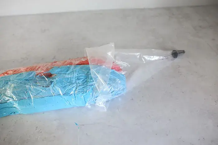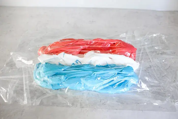 - Legg den røde og blå marengsen ved siden av den hvite delen du allerede har lagt på. Rull det hele forsiktig sammen (se bilde under). Klipp hull i den ene enden og putt den inn i en sprøytepose (Jernia). Slik blir den blå, hvite og røde marengsen liggende fint når du klemmer det ut av sprøyteposen.