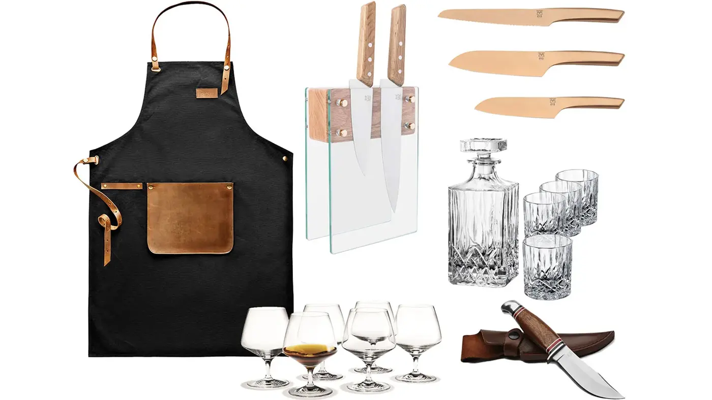 Annet godt tilbehør til kjøkkenet er et tøft forkle, eller til selskapene i julen – stilige whiskyglass eller cognacglass.