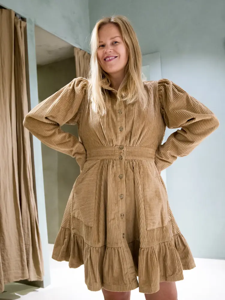 Kordfløyel er alltid en hit om høsten. Du kjører to trender i én ved å velge en brun eller lysebrun variant. Disse fargene er aktuelle i motebildet, og er veldig fin til svart eller hvitt tilbehør. Skjortekjolen styles fint med lag på lag. Med en høyhalset tynn genser under får du en stil som oser av 70-tallet.
