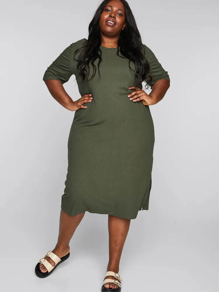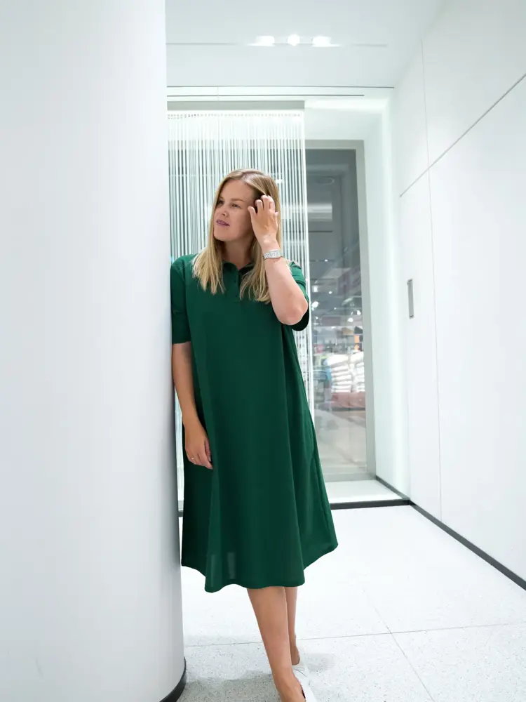 Den grønne kjolen fra Zara er avslappet og sporty. Fasongen er rett, med et lite utsving. Kle den opp med en oversized blazer og korte støvler – det gir en trendy og kul stil