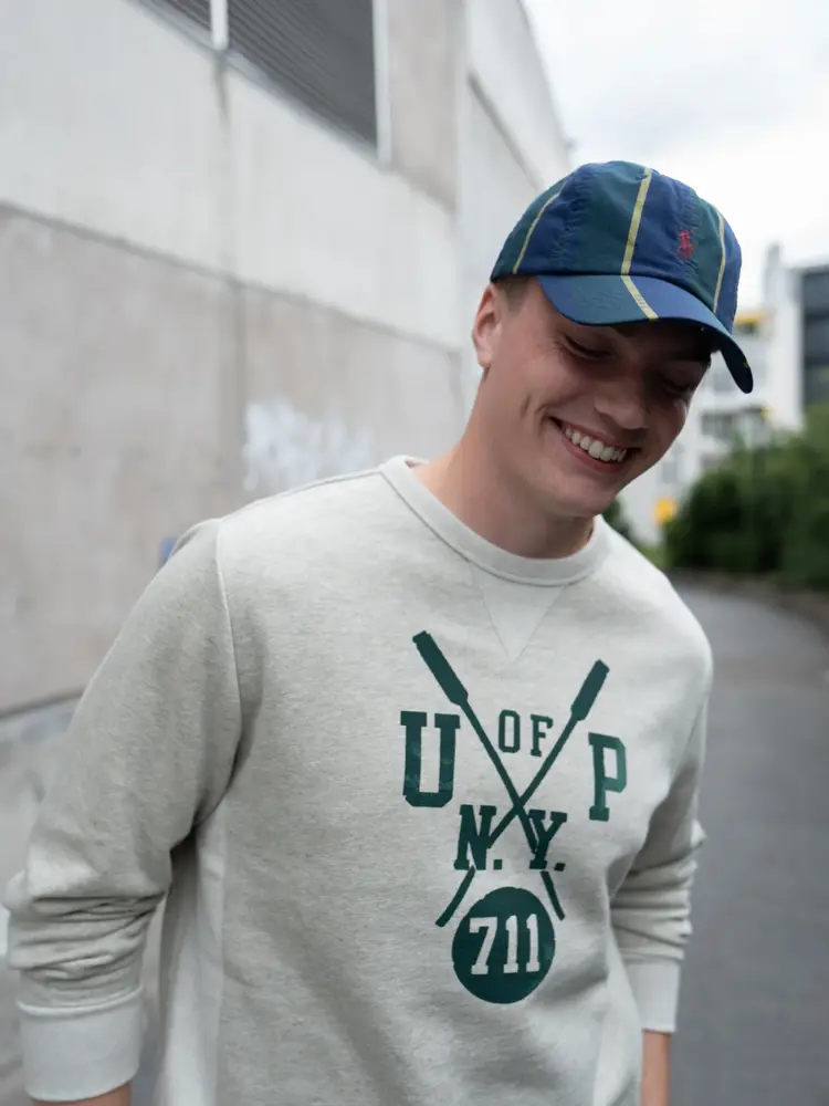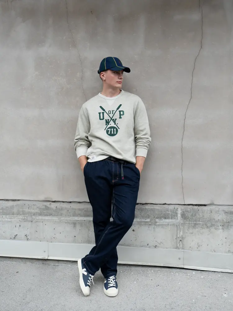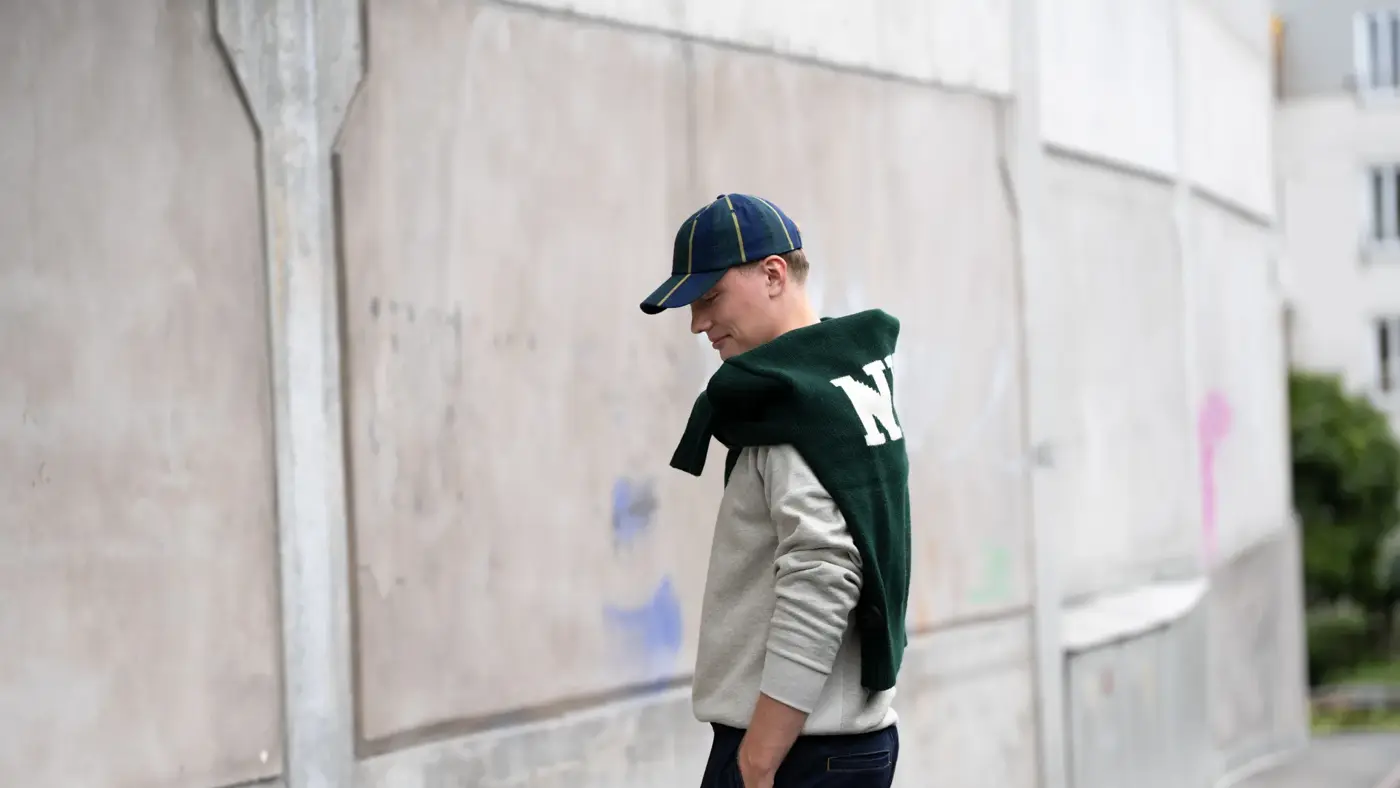 Grønn ullgenser 5600,- fra Mark+Brandy | Blå sneakers 1700,- fra Mark+Brandy | Blå bukse 1900,- fra Mark+Brandy | Grå collegegenser 2300,- fra Mark+Brandy | Caps med striper 900,- fra Mark+Brandy.