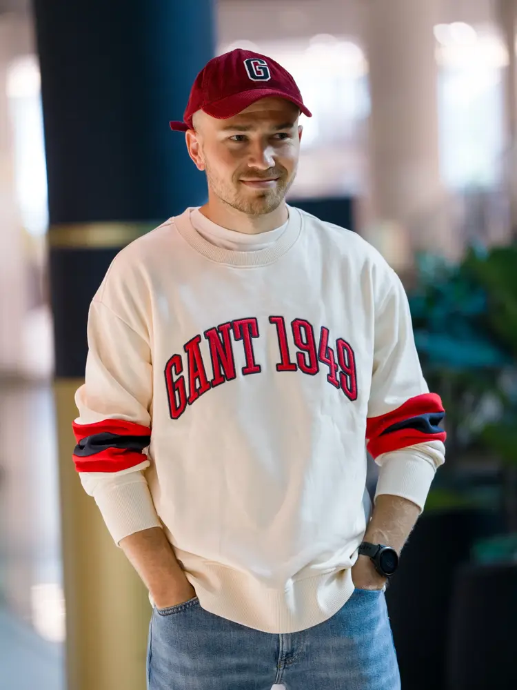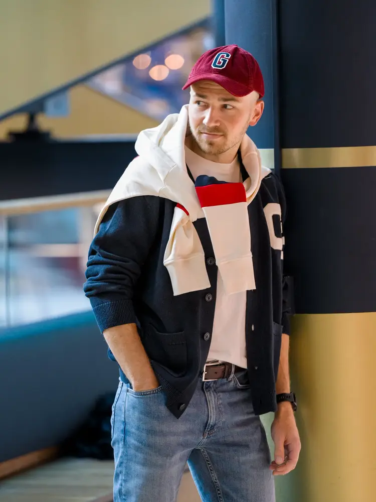 Burgunder caps 600,- fra Gant | Hvit T-shirt 600,- fra Gant | Blå jakke 1900,- fra Gant | Blå jeans 1700,- fra Gant | Brunt belte 1400,- fra Gant | Genser 1900,- fra Gant.