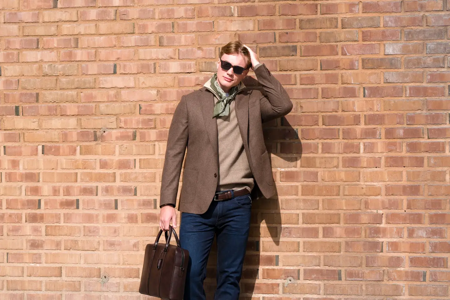 Jeans 1600,- fra 4 Men | Brunt belte 800,- fra 4 Me | Brun blazer 4500,- fra 4 Men | Brun genser med glidelås 4500,- fra 4 Men | Skjerf 1000,- fra 4 Men | Dokumentmappe i skinn 13900,- fra 4 Men | Solbriller 500,- fra 4 Men | Armbånd 1800,- fra 4 Men.