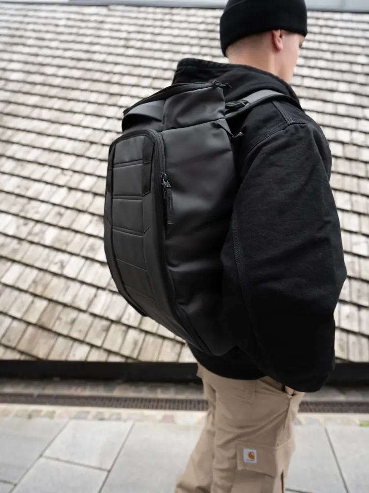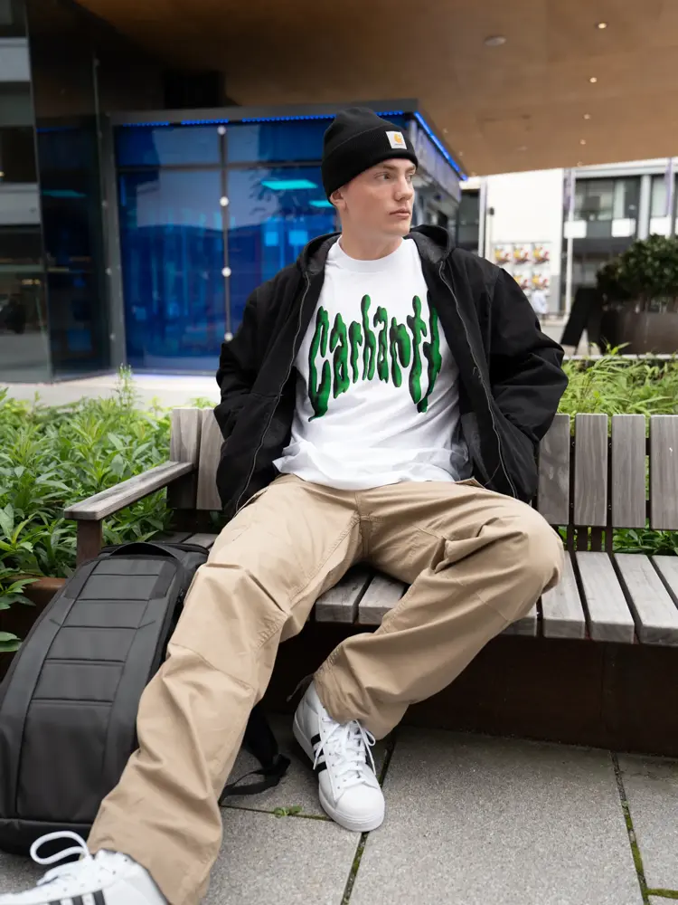 Beige bukse 1749,- fra Session | Hvit T-shirt med print 749,- fra Session | Sort jakke 3888,- fra Session | Sko 1349,- fra Session | Sort lue 398,- fra Session | Douchebag sekk 2199,- fra Session.