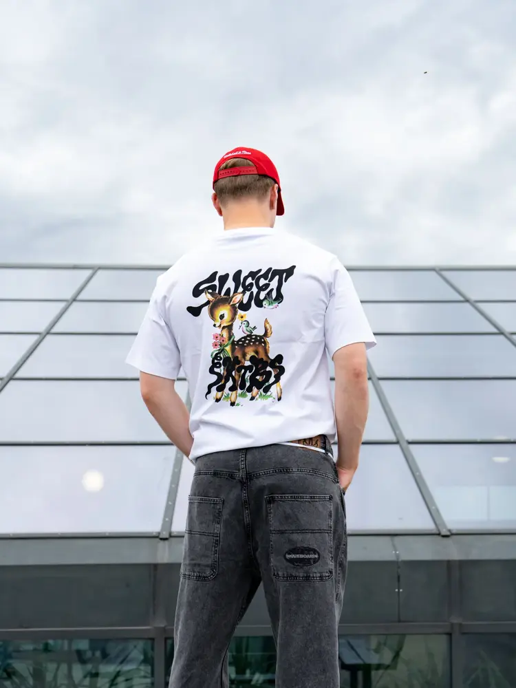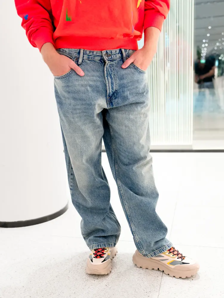 Grå baggy jeans 799,- fra Junkyard | Genser med mønster 799,- fra Junkyard | Hvit t-skjorte 399,- fra Junkyard | Converse 1019 Caps 399,- fra Junkyard.
