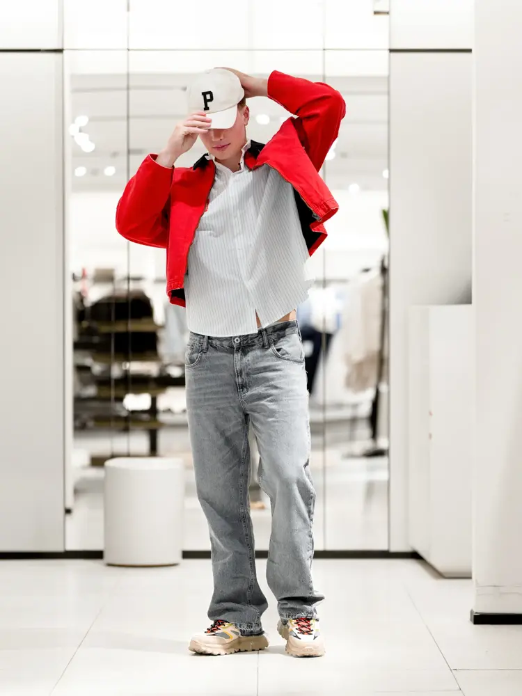 Bilde 1: Rød jakke 799,- fra Zara | Grå jeans 659,- fra Zara | Sko 499,- fra Zara | Hvit skjorte 499,- fra Zara | Hvit caps 259,- fra Zara. Bilde 2: Rød genser 499,- fra Zara | Blå jeans 499,- fra Zara | Sko 499,- fra Zara.