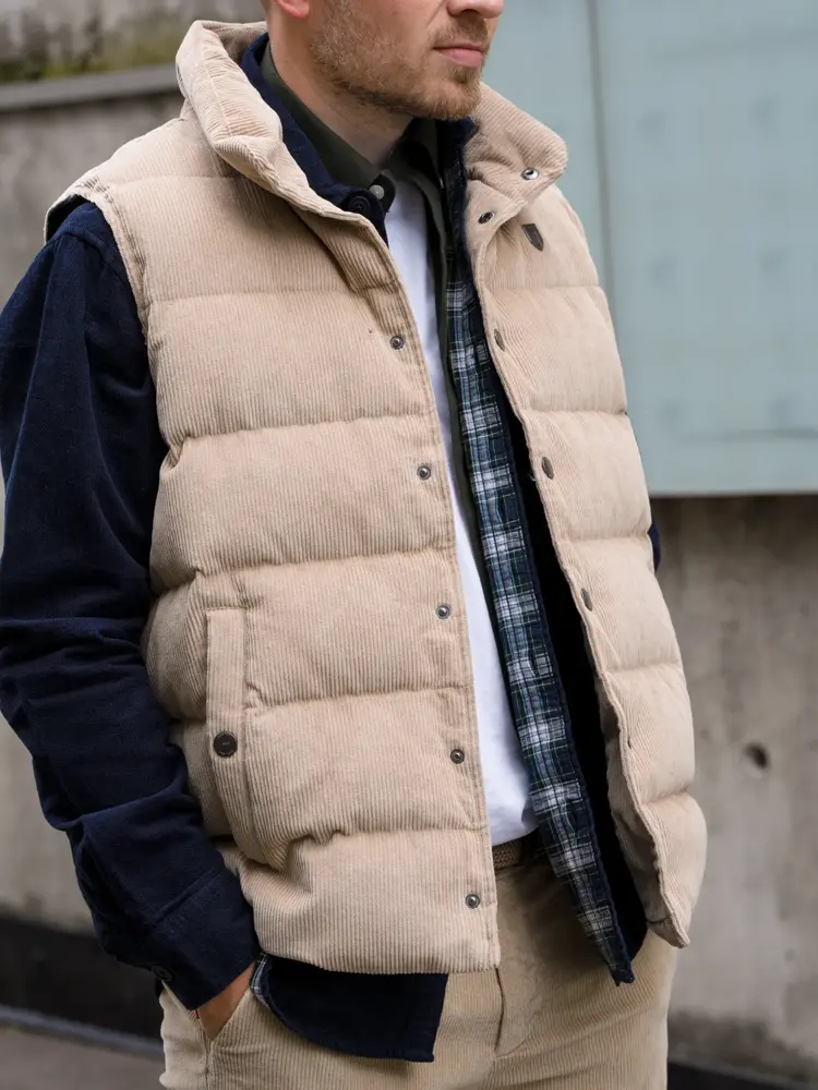 Hvit T-skjorte 399,- fra VIC | Skjorte 999,- fra VIC | Mørk blå overshirt 1499,- fra VIC | Belte 599,- fra VIC | Beige cordbukse 1599,- fra VIC | Beige boblevest 2499,- fra VIC.