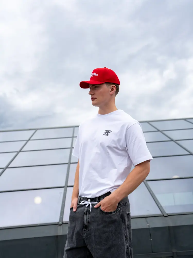Grå bukse 799,- fra Junkyard | T-skjorte med trykk 399,- fra Junkyard | Rød caps 399,- fra Junkyard.