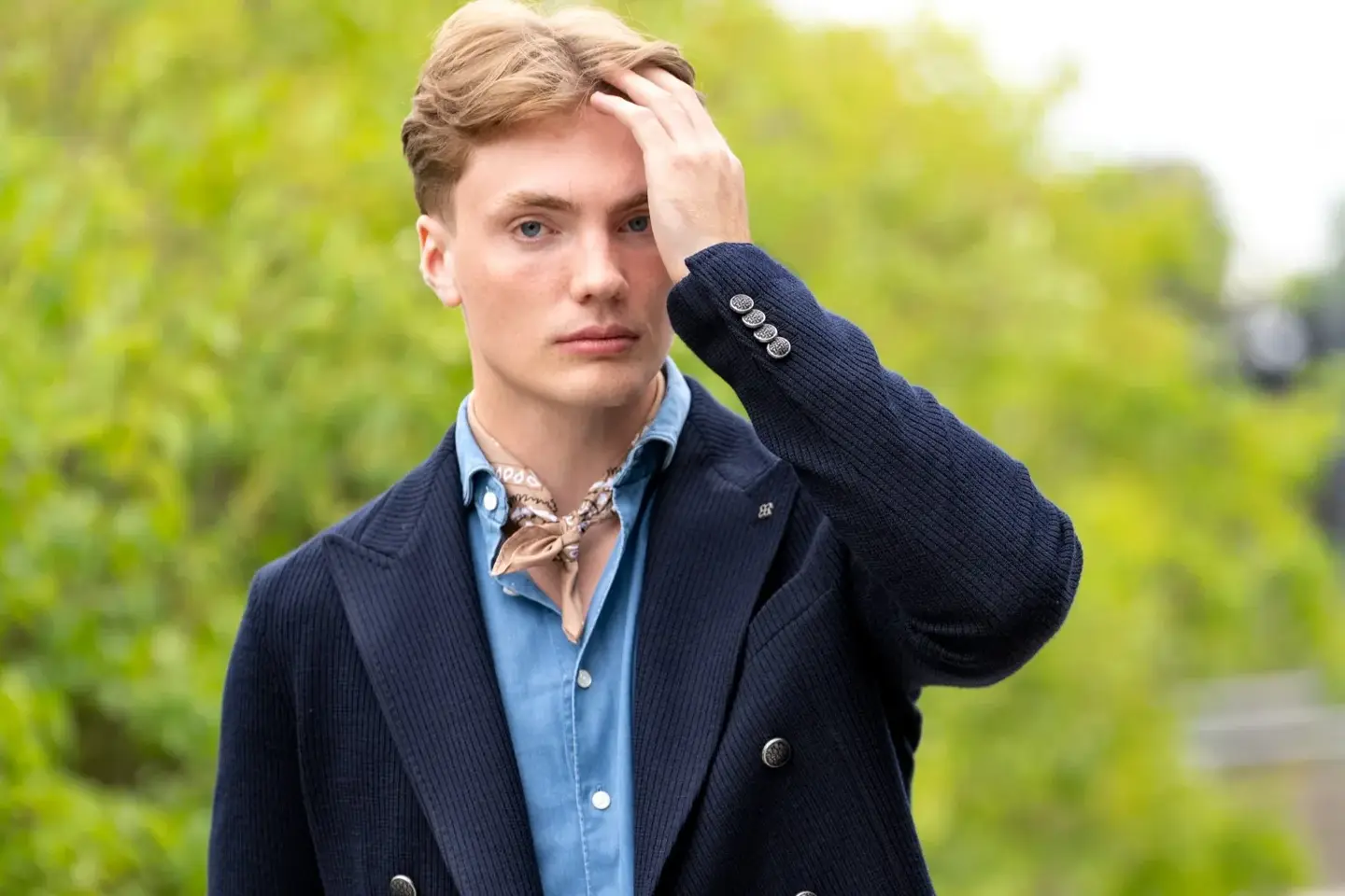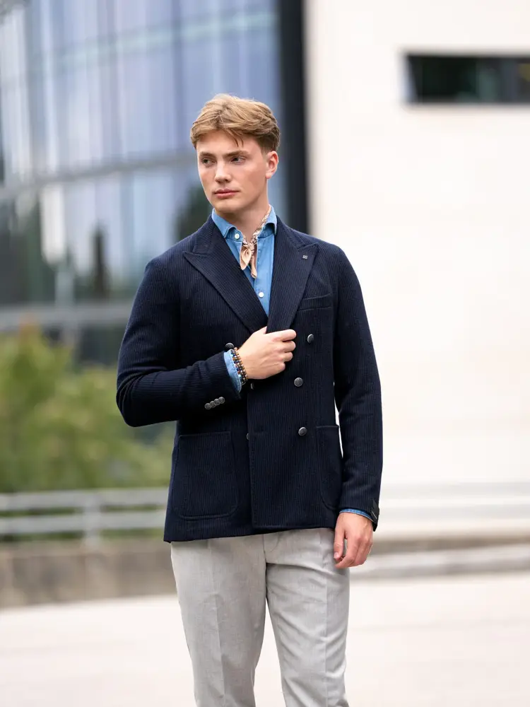 Bukse 1999,- fra Follestad | Blå skjorte 2199,- fra Follestad | Blå dobbelspent blazer 6799,- fra Follestad | Armbånd 990,- fra Follestad.