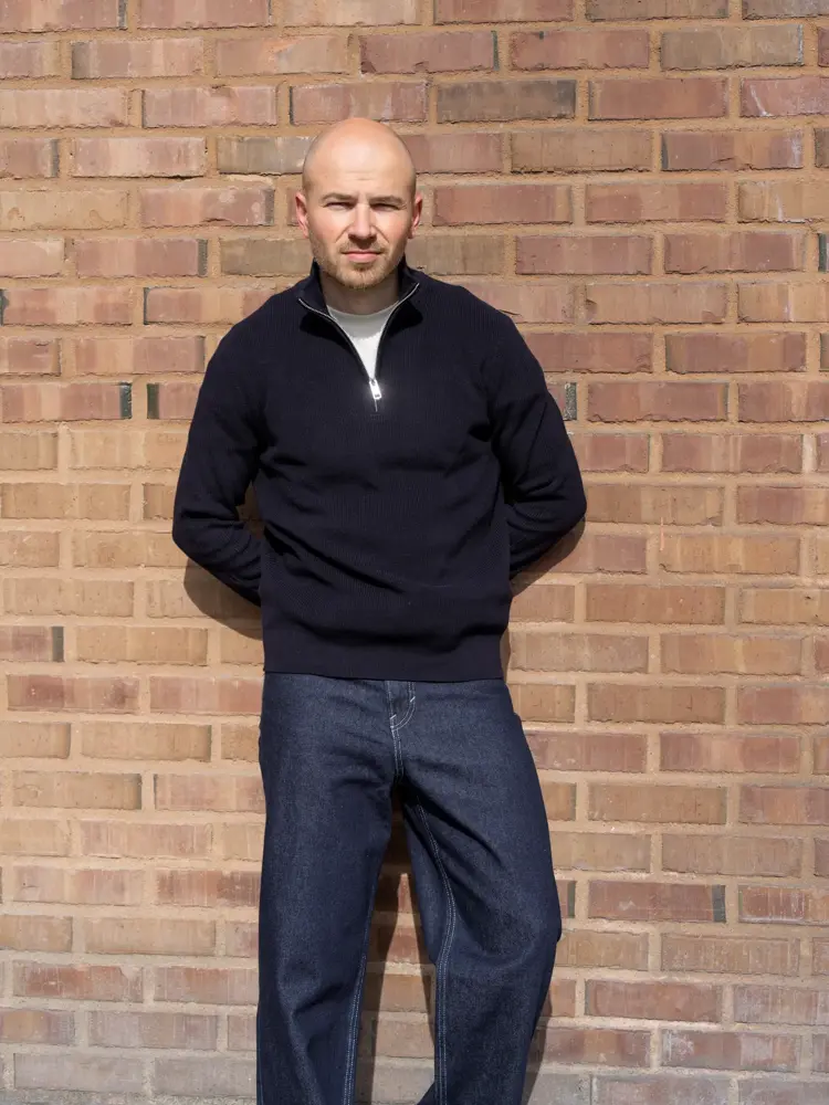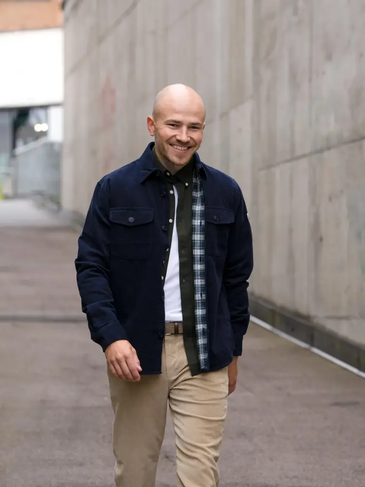 Blå zip-genser 5900,- fra Follestad | Brun bukse 3699,- fra Follestad | Overshirt-jakke 8099,- fra Follestad | Brunt belte 1099,- fra Follestad | Brun skinnbag 8400,- fra Follestad.