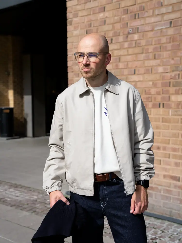 Mørk blå jeans 399,- fra H&M | Brunt belte 179,- fra H&M | Hvit t-shirt 229,- fra H&M | Jakke 499,- fra H&M | Blå zip-genser 349,- fra H&M | Briller 149,- fra H&M.