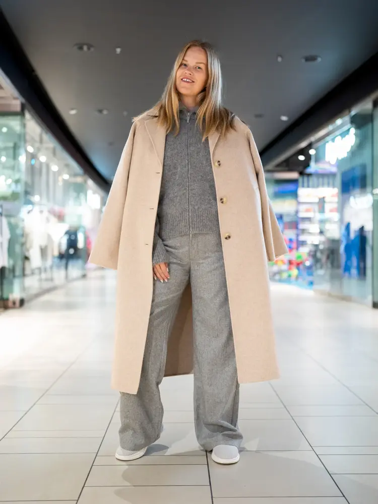 En grå ullbukse med en strikk og kamelfarget kåpe er et enkelt og flott antrekk til kalde høstdager. Fra Olivias verden.