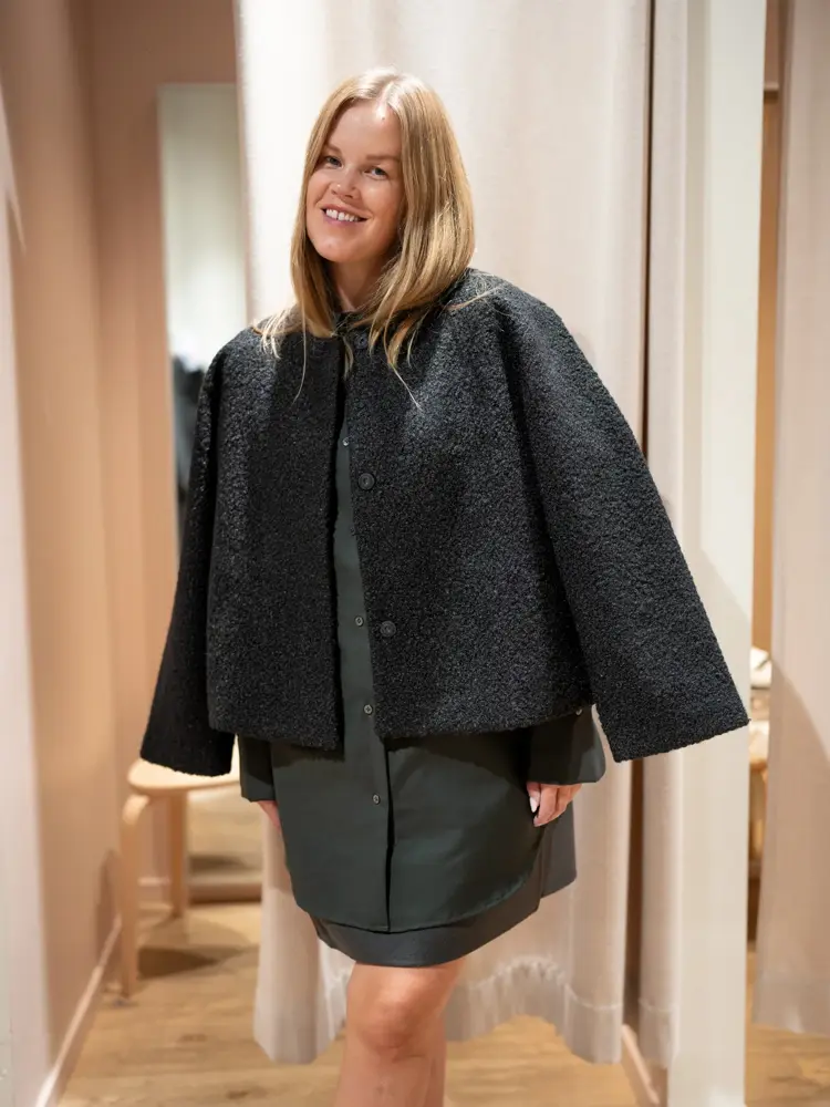 «Denne jakken er en klassiker, og mørkegrønt og svart er herlig sammen», sier Elen.