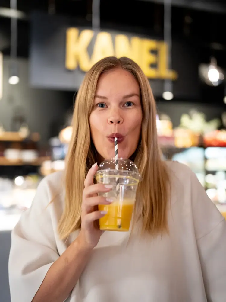 Ambassadør Elen Kristvik er lommekjent på Sandvika Storsenter, og har funnet fram sine høstfavoritter. Det inkluderer både bøker, oversizede t-skjorter og en gul smoothie fra Kanel.
