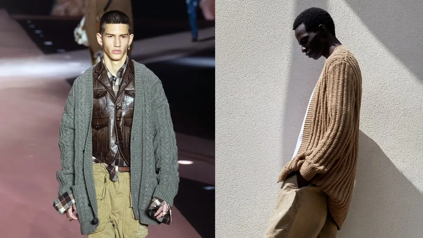 Cardigans var blant annet tilstede hos Gucci i løs og ledig passform i støvete nyanser av turkis, grønt og gult, hos Hermes i en mer elegant variant i beige med print, og hos Givenchy, Ferragamo og Dsquared2 i mørkere nyanser med et avslappet og oversized snitt.