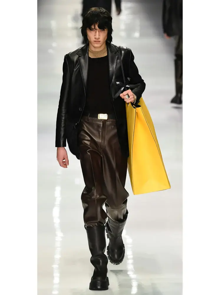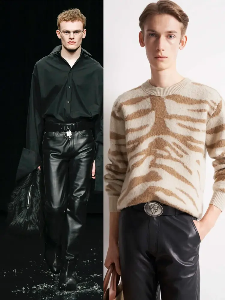 Sentrale plagg er skinnjakker og skinnfrakker – men størst av alt er skinnbuksene. Tenk Jim Morrison på 60-tallet med sorte, slim fit skinnbukser. Buksene kan du style med en hvit genser og en av sesongens oversized frakker eller cardigans, en skjorte i kordfløyel (se under) eller med en t-skjorte og blazer.