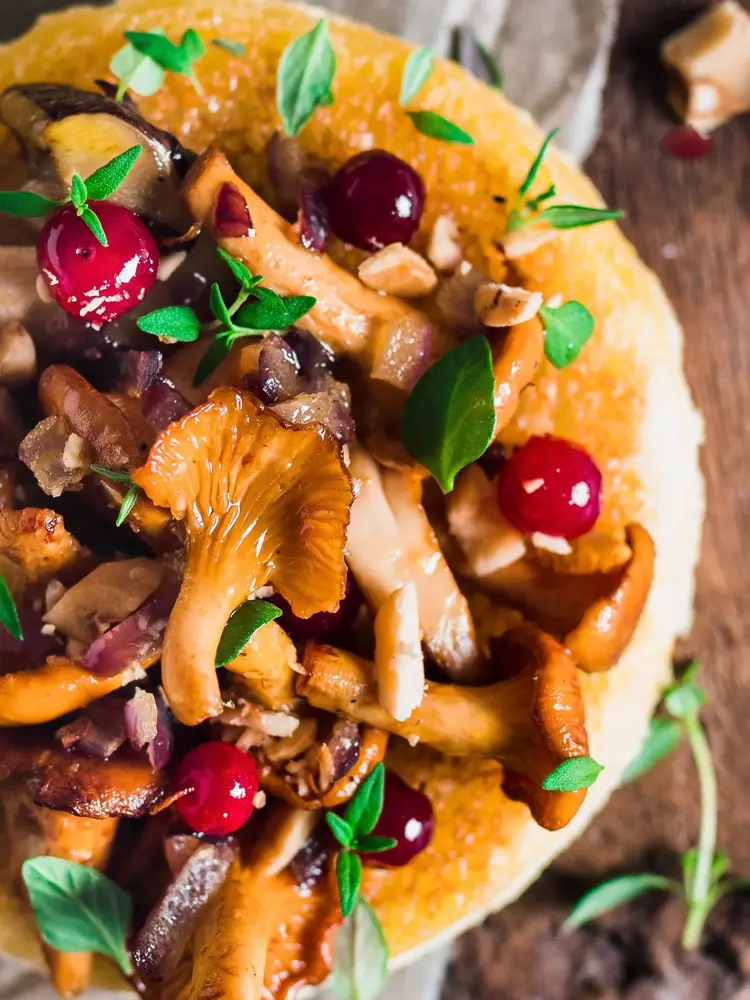 Topp toastene med stekt sopp, syltede tyttebær, frisk timian og hasselnøtter.