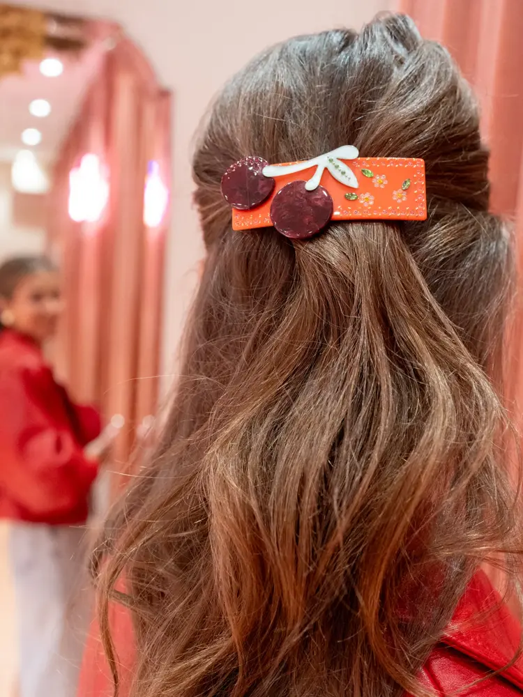 -«Så mange fine hårspenner her, elsker en brun variant med månedekorasjon, eller en oransje hårspenne med kirsebær. Så søte», sier Nina.