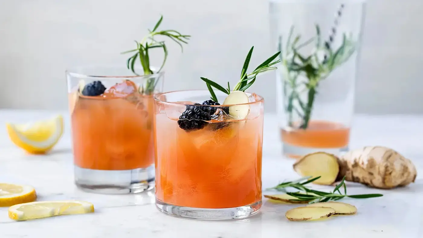 - Mos skivet ingefær og rosmarin. Hell over eple- og mangojuice, tranebærjuice og sitronsaft og rør forsiktig. Fyll drinkglass med is og sil juiceblandingen over i glassene. Topp opp med mineralvann og pynt med skiver av frisk ingefær, rosmarin og bjørnebær.