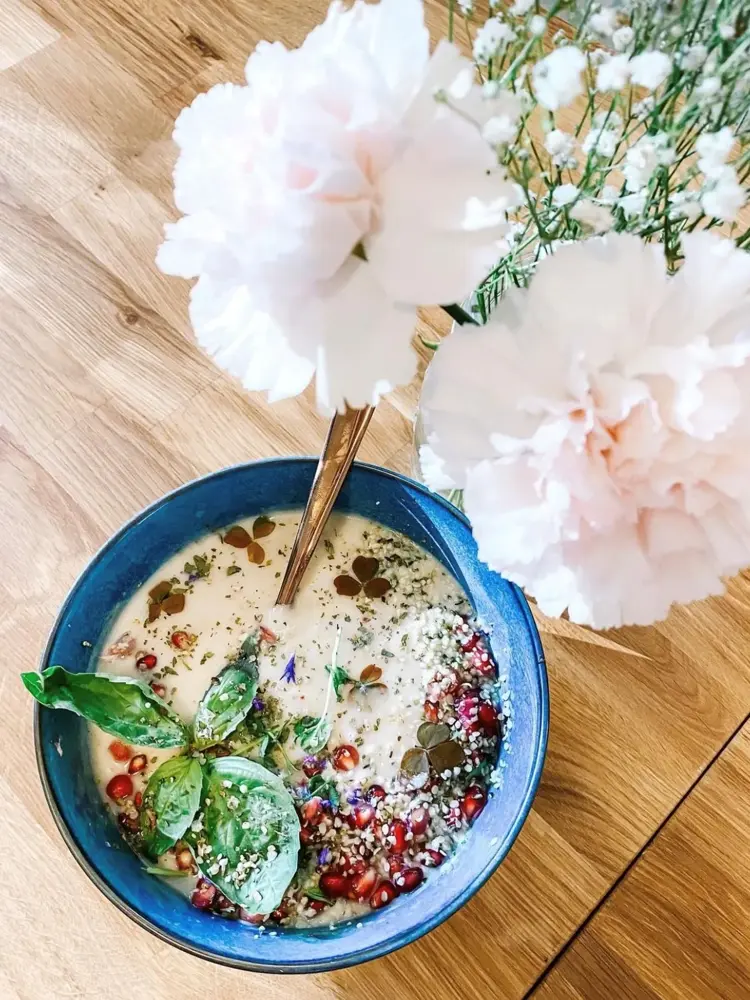 - Del så opp blomkål og gulrøtter og ha oppi løken sammen med kraft. Tilsett en dl vann om du vil ha suppen litt tynnere. Ha over lokk og la grønnsakene koke/dampe. Kjør alt i en blender eller med stavmikser til en glatt suppe sammen med fløten og smak til med salt og pepper. Topp med frø, granateplekjerner og eventuelt pølsebiter eller bacon.