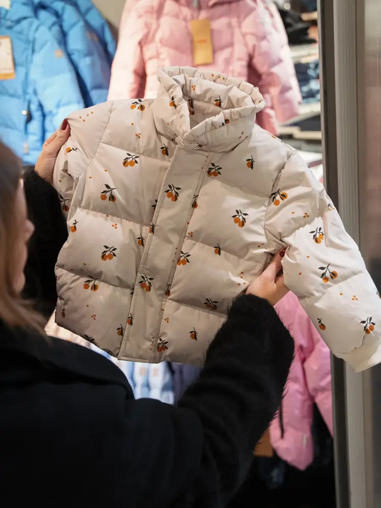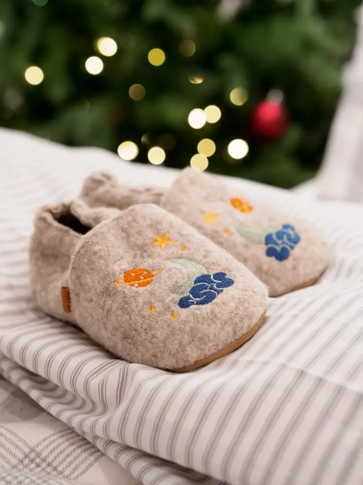 Venstre: Dunjakke fra Junior barneklær, kr 1999. Høyre: Barnetøfler med solsystemet fra Junior barneklær, kr 359.