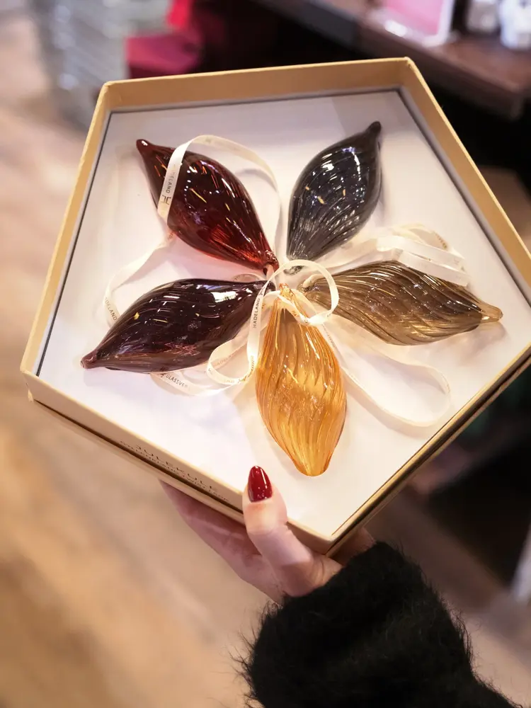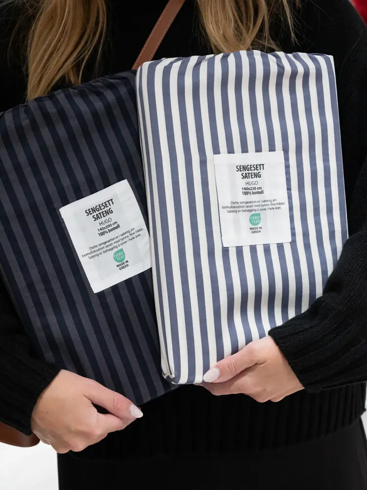 Venstre: Glasskuler fra Christiania glasmagasin, kr 599. Høyre: Stripete sengesett fra Princess, kr 699.