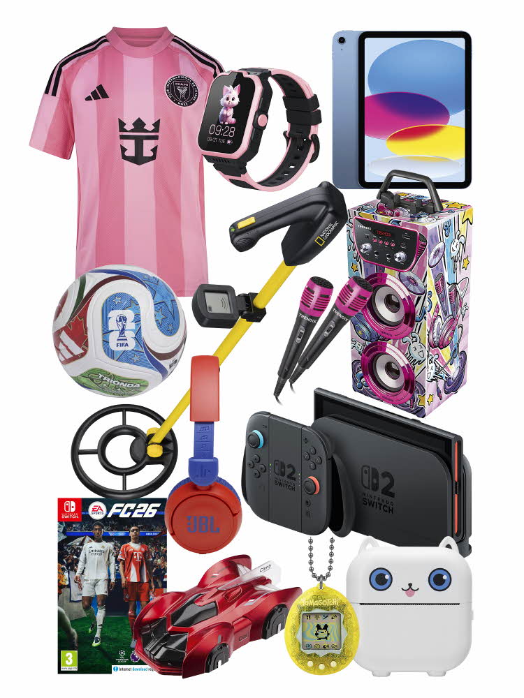 Fotballdrakt, Inter Miami Fotballshop 1.299,- / Smartklokke, ZTE ICE 1.590,- / iPad Eplehuset fra 4.990,- / Fotball Torshov Sport 499,- / Metalldetektor Sprell 699,- / Karaokemaskin Ringo Leker 699,- / Hodetelefoner Kjell & Company 499,- / Nintendo Switch 2 + Mario Kart World-pakke Elkjøp 6.695,- / Spill ”FC26” Elkjøp Phonehouse 699,- / Fjernstyrt bil til vegg og tak Clas Ohlson 199,90 / Tamagotchi Ringo Leker 399,- 12 | Mini printer Kjell & Company 349,-