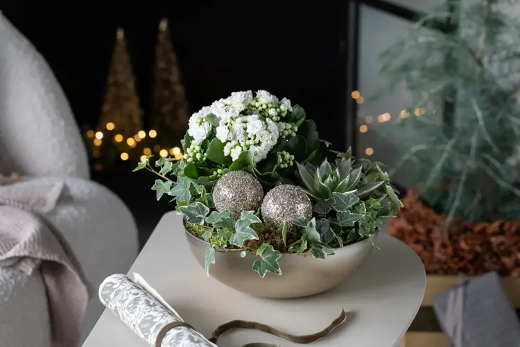 Ferdige dekorerte potter med blomster og julekuler er en gave som varer lenge.