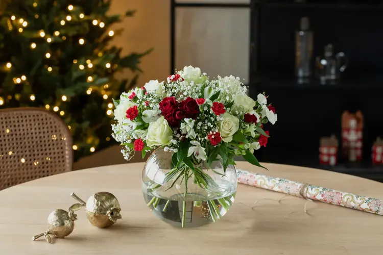 En vakker julebukett er alltid populært, og rødt og hvitt er de mest populære fargene i julen. En bukett er også flott å ta med som en oppmerksomhet til vertskapet hvis du skal på julebesøk. Et lite tips er å levere blomstene på forhånd, så kan de brukes i pyntingen og stå klare på bordet når gjestene kommer.