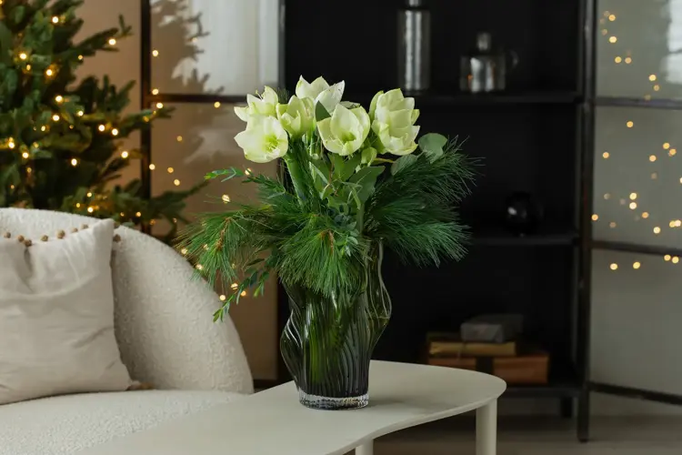 Amaryllis sammen med grønne grener er elegant og klassisk.