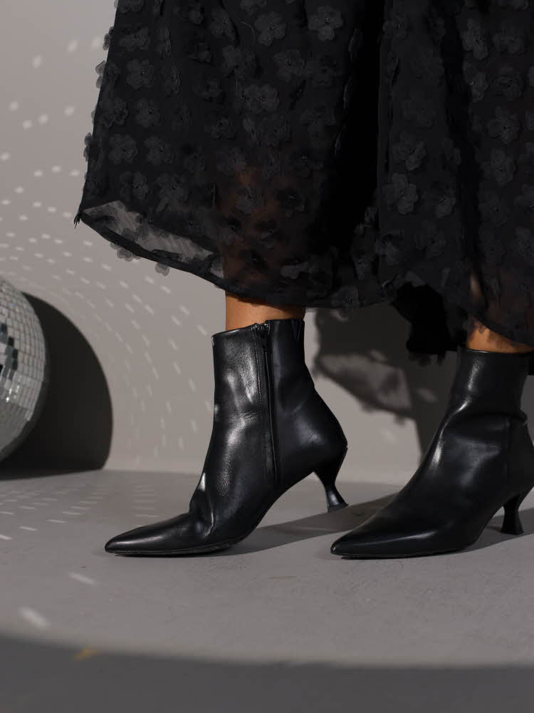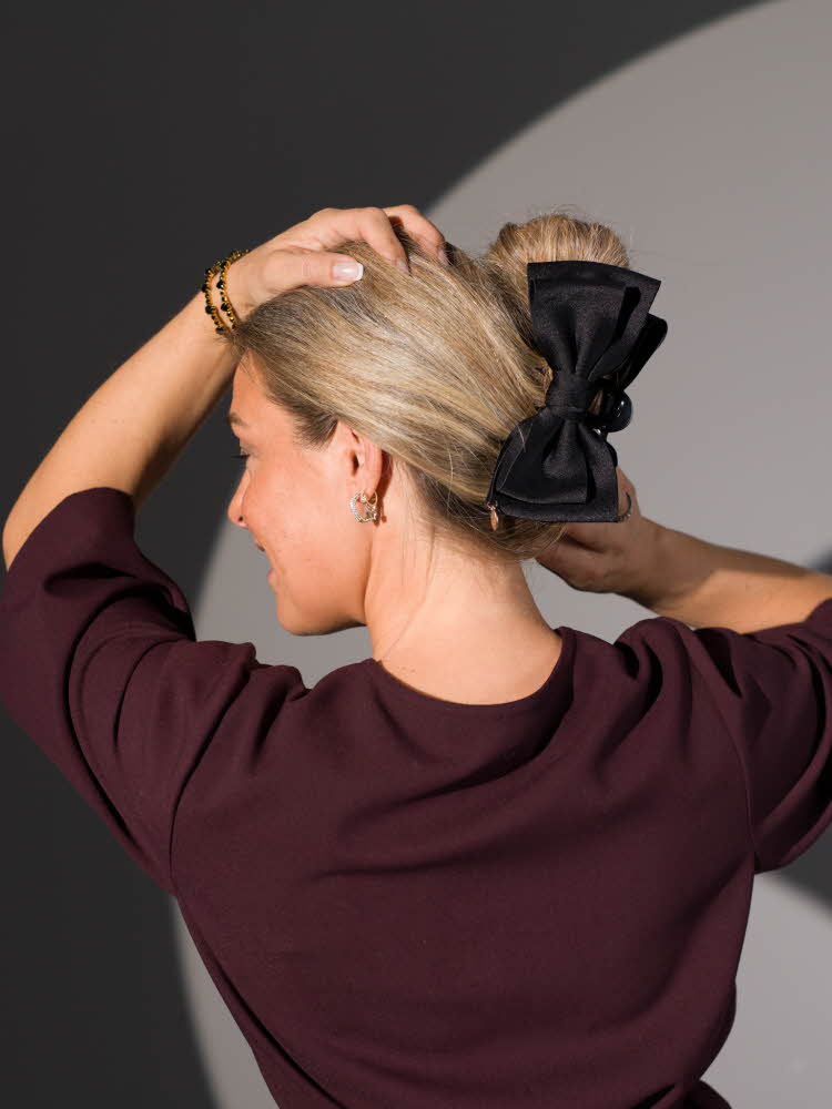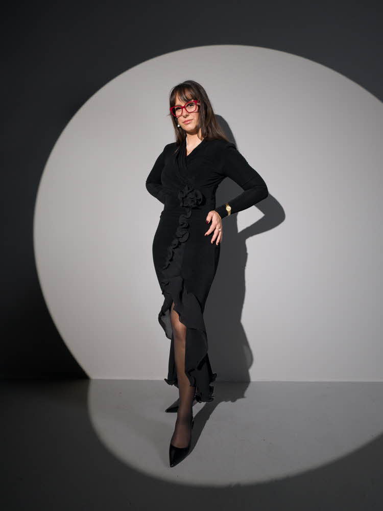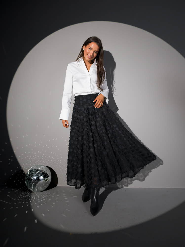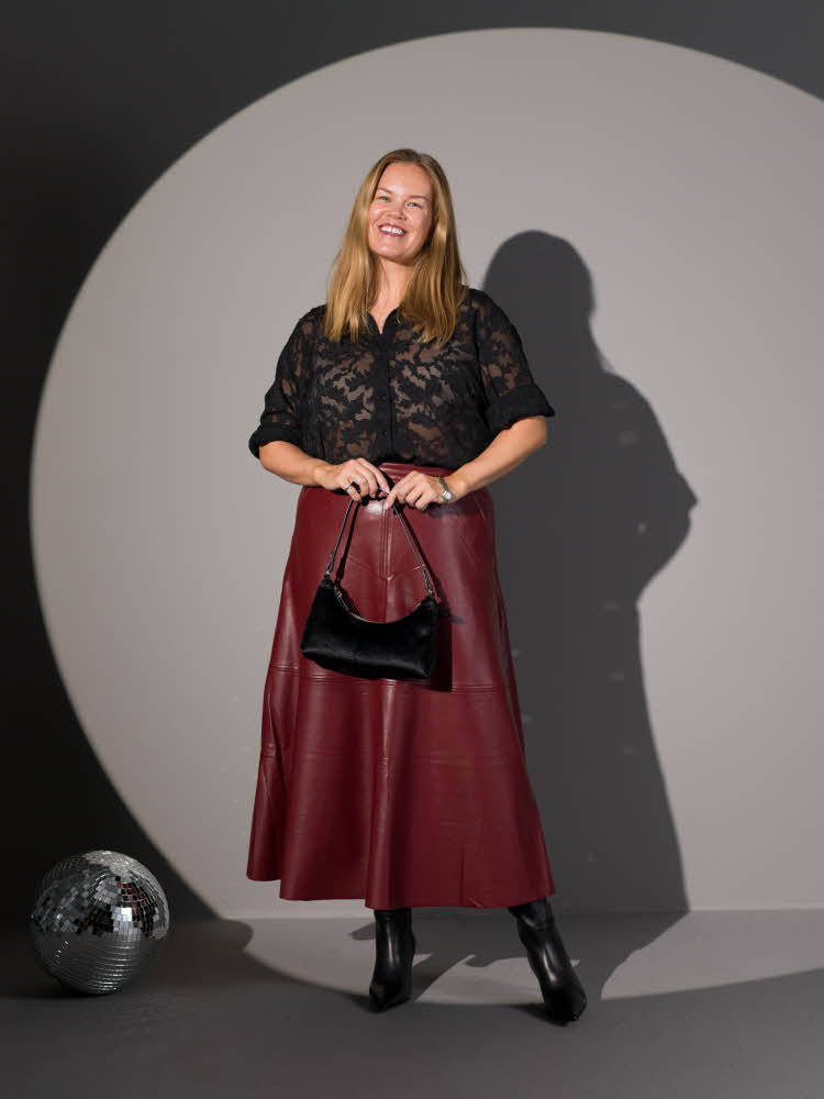 -Svart funker alltid, være seg den lille svarte kjolen, vest og dressbukser, snuppete jakke til bukser eller en lengre ettersittende kjole. Mange føler seg også komfortabel i svart, og da er det et godt alternativ. Med elementer som fløyel, silke og sateng eller litt metallisk bouclé blir antrekket mer klart for fest. Røde lepper, oppsatt hår og smykker bidrar også, sier Elen.