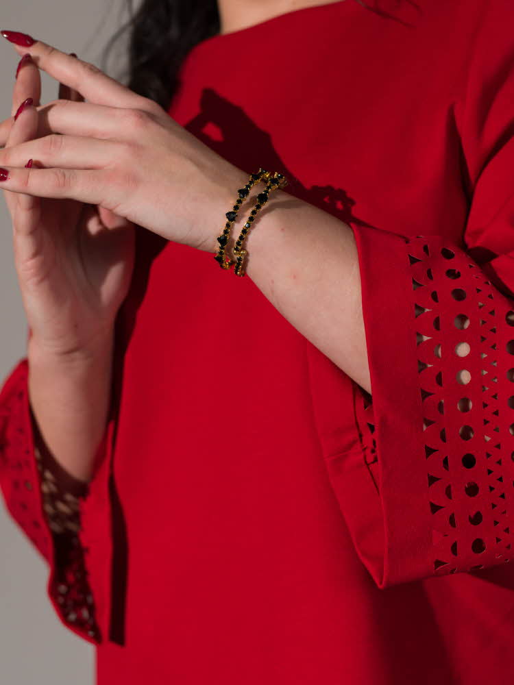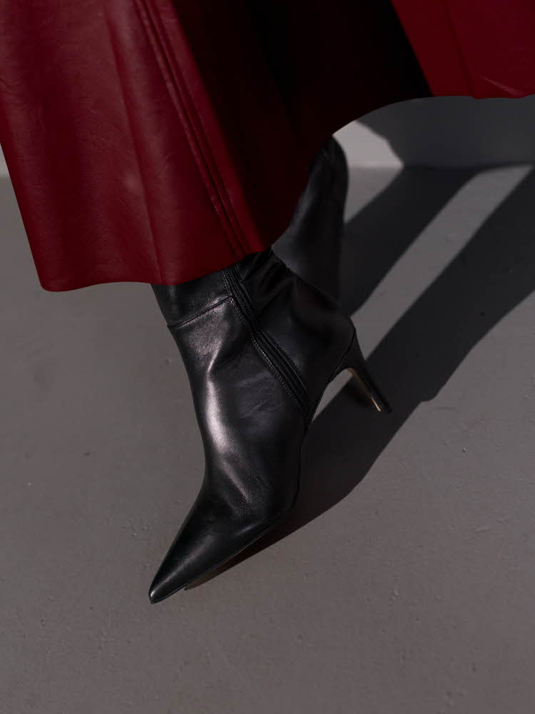 De Fem Hjørner rød minikjole med lange ermer 3999,- pumps 2699,-