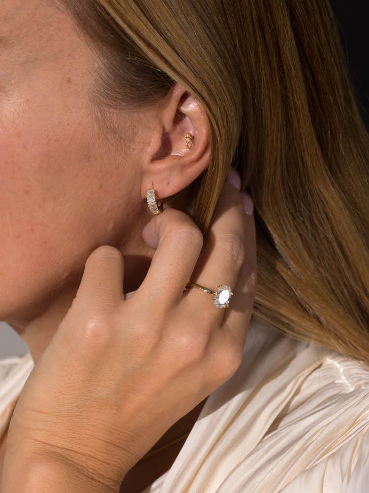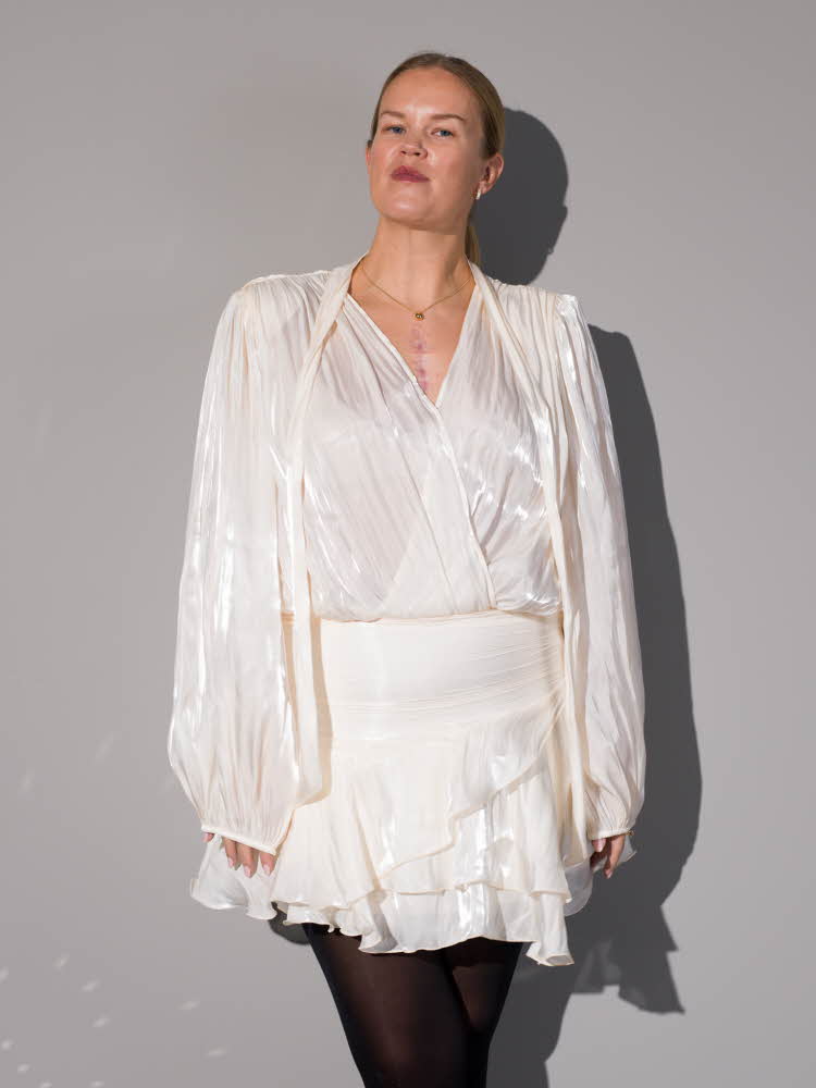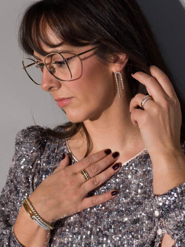 -Hvit kjole med tilbehør i perlemor og gullsko oser av fest. Diamanter på fingrene er prikken over i’en til alle antrekk, og hos Gullfunn har de nå fått inn labdyrkede diamanter, sier Elen.
