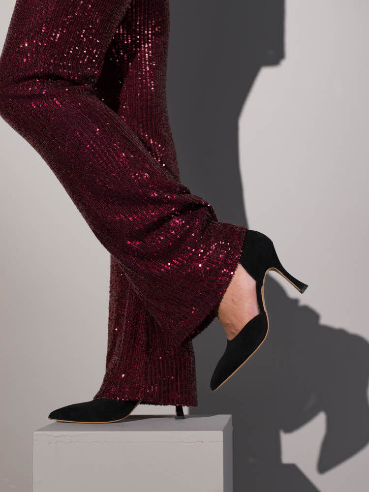 De Fem Hjørner rød velurkjole 2599,- sorte lakkpumps 2199,- sort sløyfe 450,-