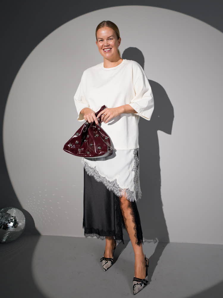 -Det er mange måter å pynte seg på! Jeg elsker å overraske, og det gjør man for eksempel med et grått sett i nålestriper, skjorte til et skjørt med transparente partier, en hel dress i silke eller hvit blonde-t-skjorte til svart blondeskjørt, for å nevne noe. Her er det bare fantasien som setter grenser!