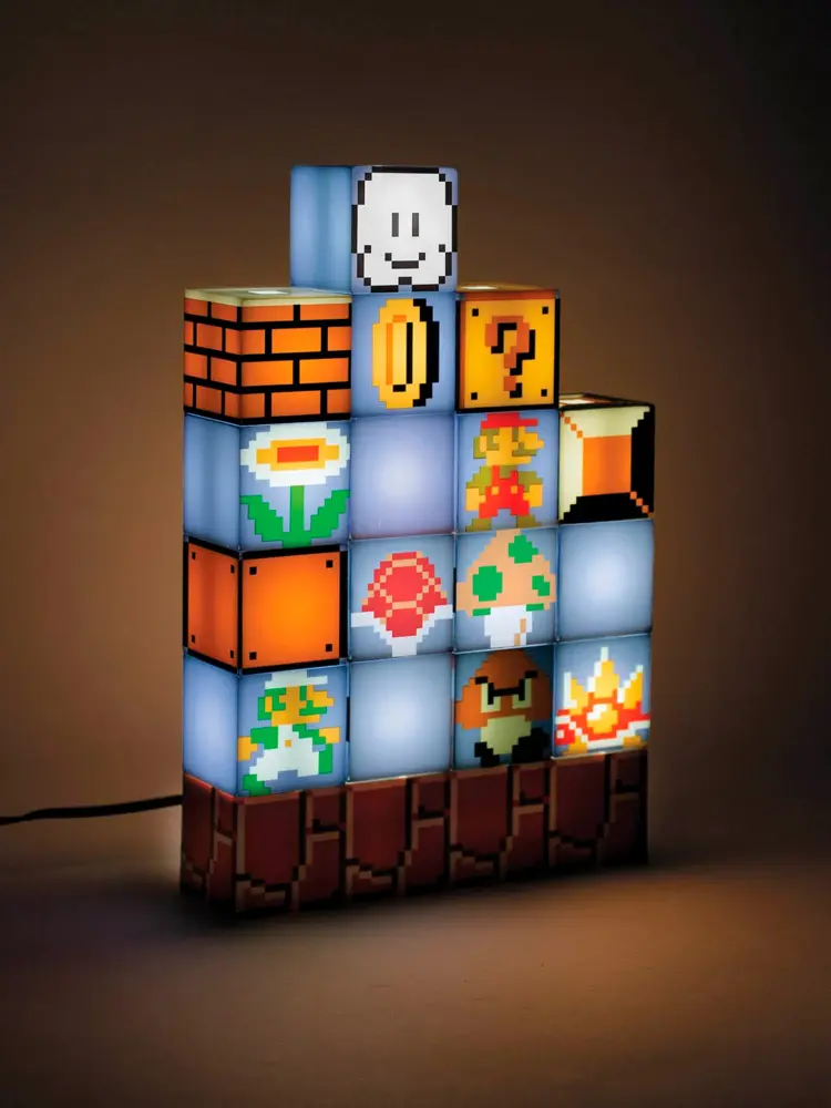 Bygg ditt eget Super Mario-lys med 16 klosser. Lampen kobles til stikkontakt via strømledning som følger med.