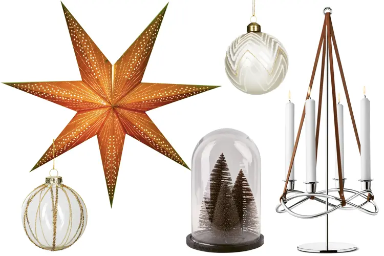 Julestjerne med lys fra Karjolen, kr 499,- / Transparent julekule fra Kremmerhuset, kr 39,90,- / Juledekorasjon fra Kid Interiør, kr 299,90,- / Hvit julekule fra Kremmerhuset, kr 49,90,- / Adventsstake fra Georg Jensen/Tilbords, kr 849,- / Oppheng i skinn fra Tilbords, kr 799,-