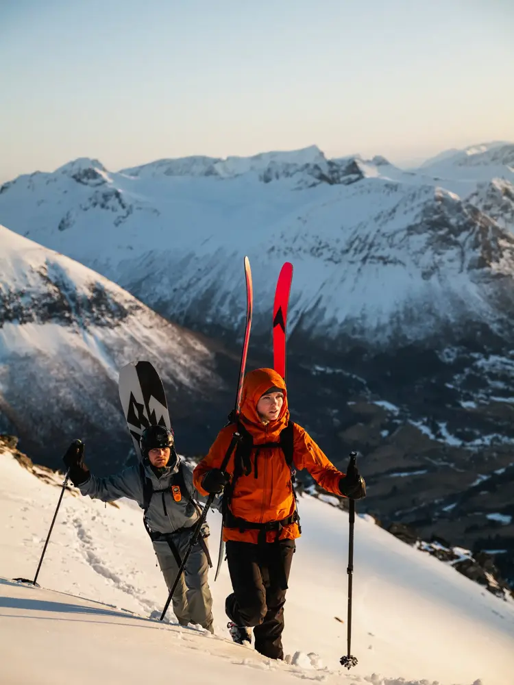 Eline: Skibukser, We Norwegians Anton Sport / Skijakke, We Norwegians Anton Sport / Ullgenser, We Norwegians Anton Sport / Mellomlagsjakke, Fusalp 4Women / Boots, Emu Mark+Brandy / Hjelm Sweet Protection Anton Sport / Googles, Oakley Anton Sport / Peder: Skibukse Norrøna / Skijakke Norrøna / Vest Norrøna / Googles Norrøna / Hjelm, Sweet Protection, Anton Sport / Boots, Diemme, Mark+Brandy / Ski, Black Crows Anton Sport / Shehab: Overdel, Oakley Session / Snowboardbukse, Oakley Session / Buff, Oakley Session / Snowboard, Ride Warpig Session / Boots, Diemme Mark+Brandy / Googles, Oakley Session.