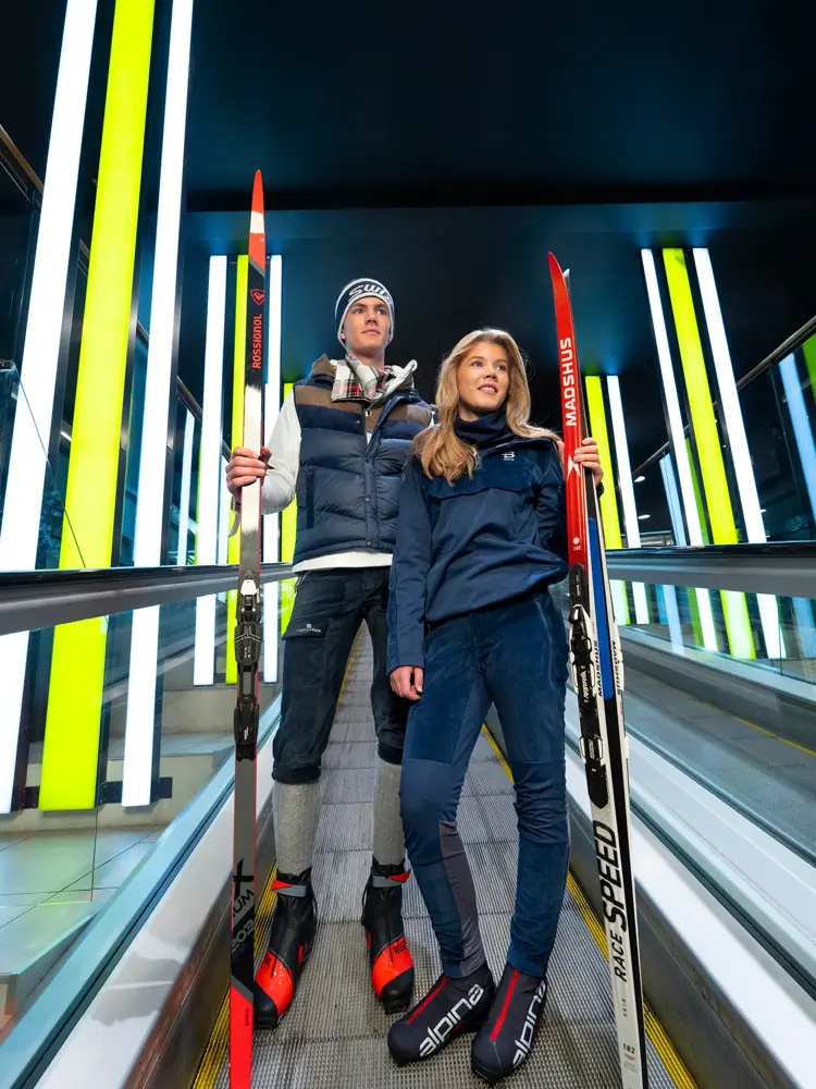 Eline: Langrennsbukse, Bjørn Dæhli XXL / Anorakk, Bjørn Dæhli XXL / Ski, Madshus XXL / Skisko, Alpina XXL / Buff Woolland / Peder: Nikkers, Amundsen Sports Anton Sport / Strømper, Amundsen Sports Anton Sport / Skjerf, Amundsen Sports Anton Sport / Anorakk, Bjørn Dæhli XXL / Vest Woolland / Skisko, Rossignol XXL / Ski, Rossignol XXL / Lue, Swix XXL.