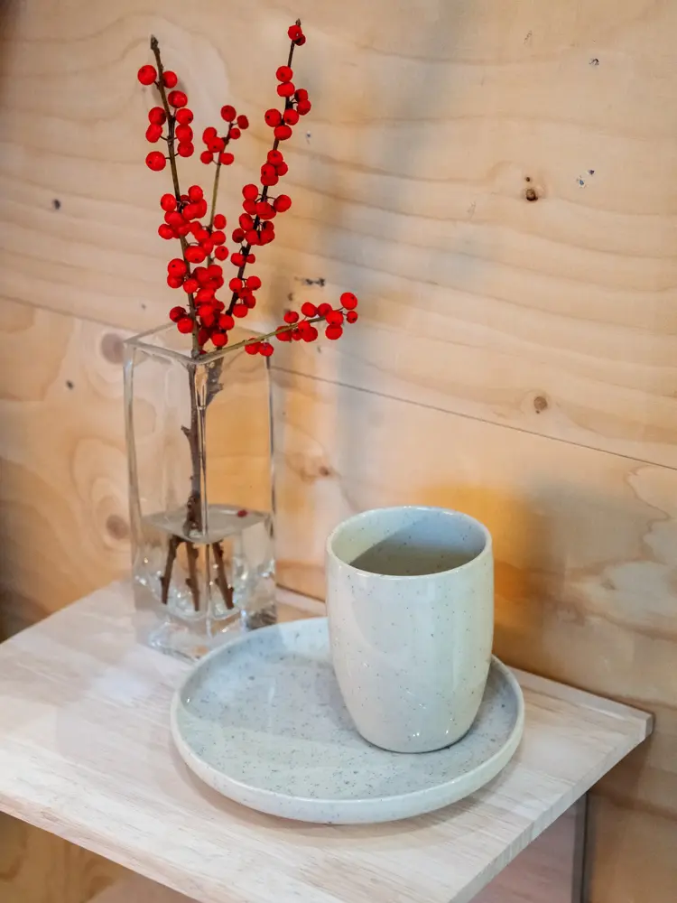 Server en varm kopp i lys og vakker keramikk, og plasser en julekake eller tre på en søt asjett.