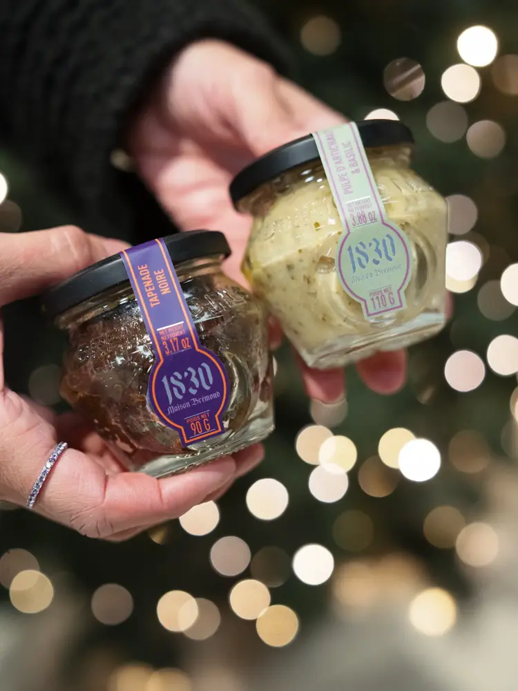 Tapenade fra Olivenlunden 1830, kr 129, artisjokkrem med basilikum, kr 129, sennep med mørk balsamico, kr 129, sennep med honning, kr 149