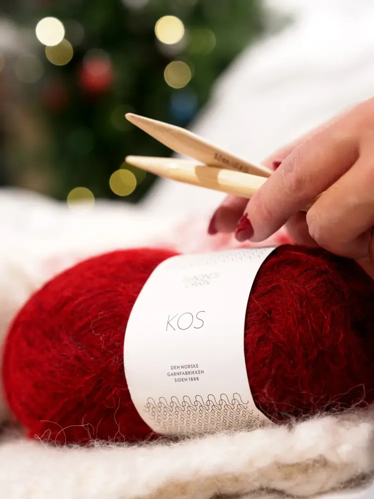 Garnnøster fra Venstre: Rett & Vrang, kr 109 for hvit, kr 109 pr nøste, strikkepinner, kr 243. Høyre: Serviett med julebordet fra Søstrene grene, kr 55,70.