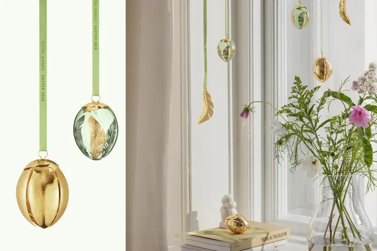 George Jensen lager vakker påskepynt. Gullegg 389,- og egg med fjærdekor 319,- Illums Bolighus.