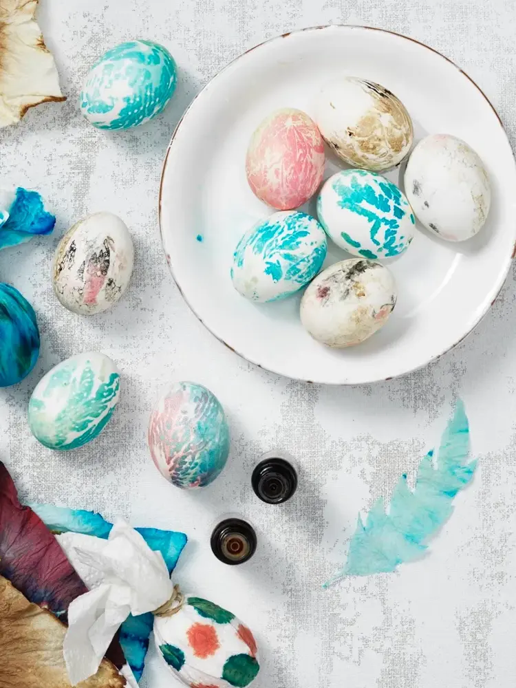 Farg egg med bruk av tie-dye. Spør en av de kunnskapsrike ansatte på Panduro Hobby om fremgangsmetode.