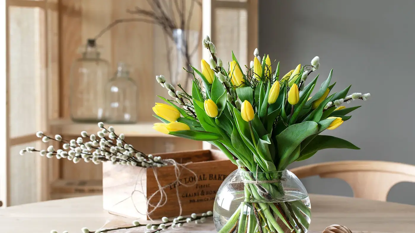 Med gule blomster og litt påskepynt har du skapt den rette påskestemningen. Hos Mester Grønn kan du velge mellom koselige påskekyllinger, påskeharer, hengende påskeegg eller annen påskepynt.