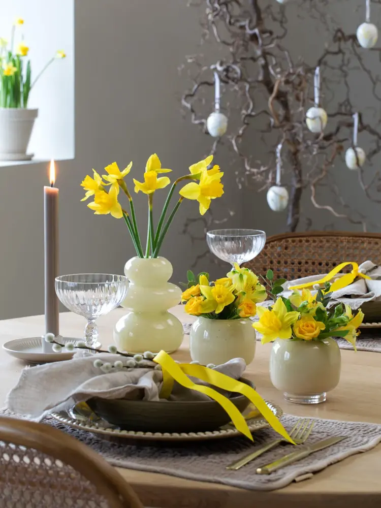 Pynt bordet med små vaser og gule blomster for den ultimate påske-stemningen
